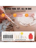 Ο περιστρεφόμενος τροχός συνοδεύεται από ένα σετ εργαλείων 17 τεμαχίων που περιλαμβάνει 8 εργαλεία από ανοξείδωτο χάλυβα, 8 ξύλινα εργαλεία και μια αδιάβροχη ποδιά. Είτε είστε επαγγελματίας στο στούντιο, δάσκαλος στην τάξη ή λάτρης του DIY, αυτό το μηχάνημα είναι η ιδανική επιλογή.