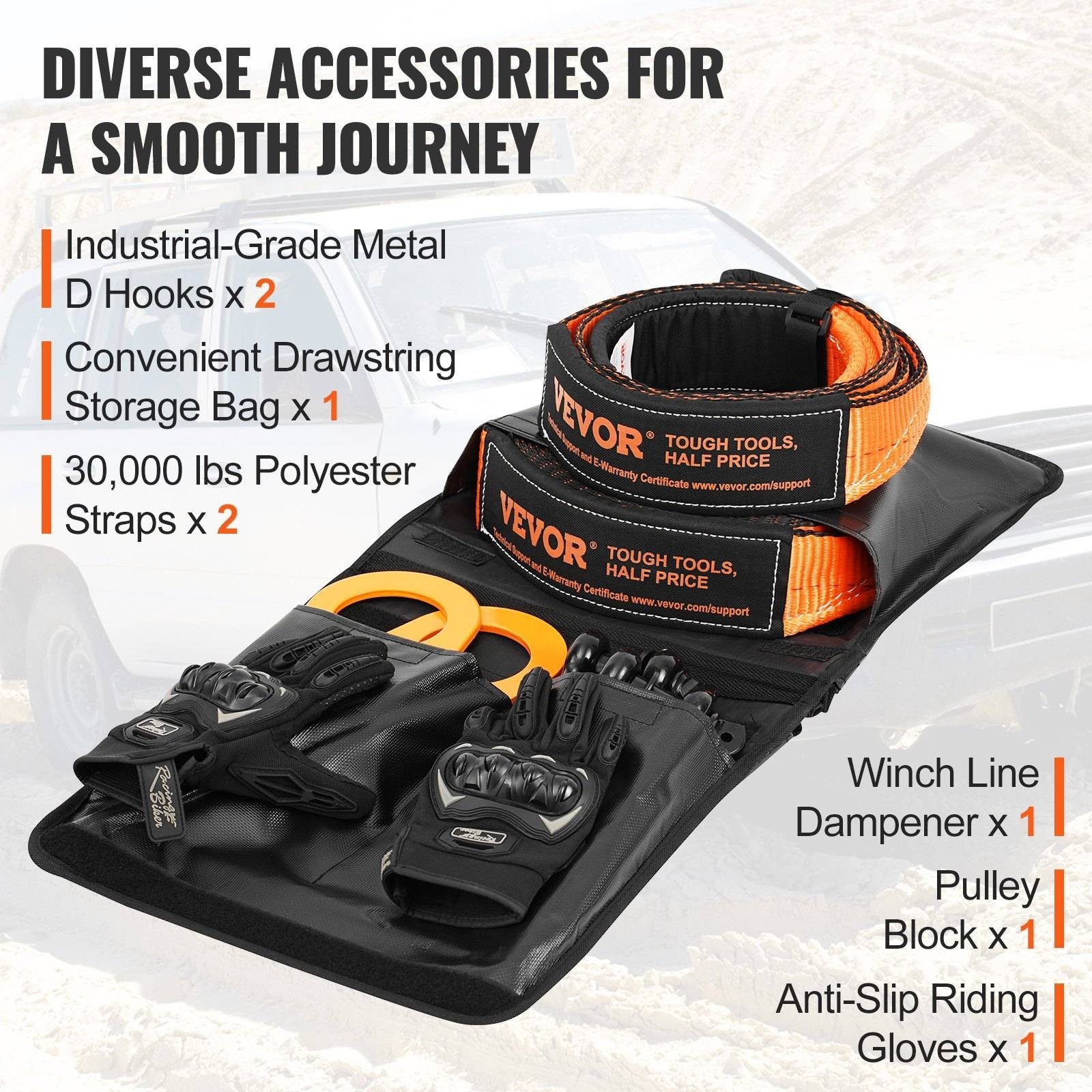 Συνδέστε απευθείας για ευθύγραμμο τράβηγμα, αγκυρώστε σταθερά σε σταθερά αντικείμενα ή χρησιμοποιήστε μια τροχαλία (περιλαμβάνεται) για επιπλέον ορμή! Το κιτ ανάκτησης Jeep θα σας βοηθήσει να ξεπεράσετε τα εμπόδια με ευκολία και να διασφαλίσετε ότι το όχημά σας θα φτάσει ομαλά στον προορισμό του. Ξεκινήστε την περιπέτεια, χωρίς να ανησυχείτε!