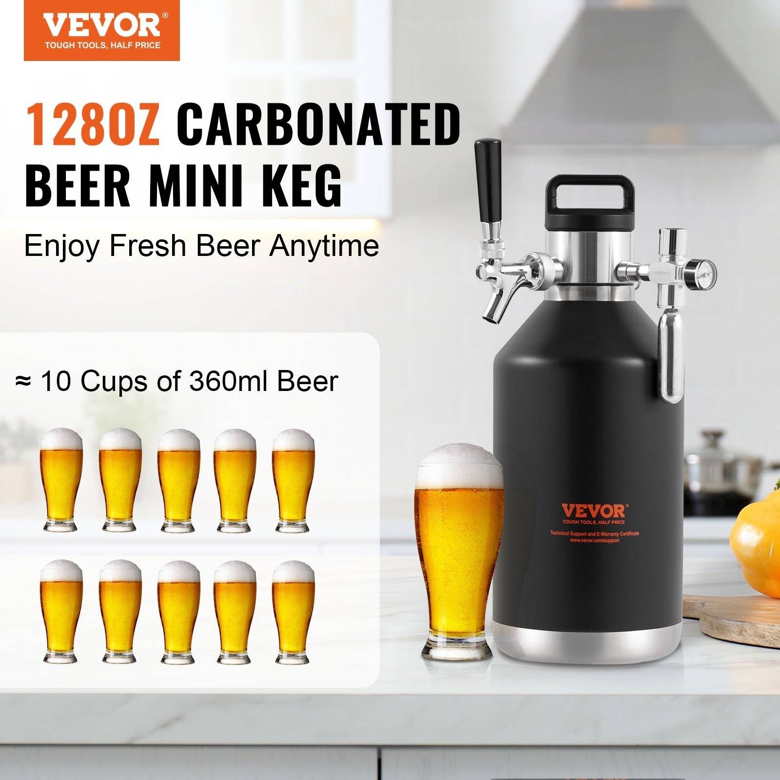 Ένα μίνι βαρέλι 128 ουγκιών (4 λίτρα) για ανθρακούχα μπύρα με διαστάσεις 8,3 x 8,3 x 15,7 ίντσες (211 x 211 x 399 mm) και ενσωματωμένη λαβή μεταφοράς. Είναι κατάλληλο για πάρτι στο σπίτι ή κάμπινγκ στην ύπαιθρο.