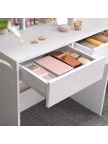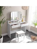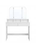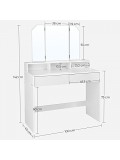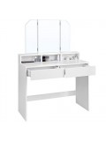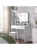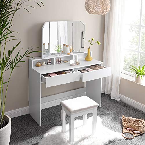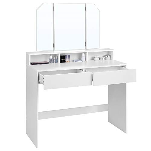 FOLD THE WINGS: The large, 3-part mirror on this makeup table is foldable. The two side mirrors can be folded so you can admire your fantastic makeup from different angles and easily arrange your hairstyle,ALL ALREADY HERE: Tired of hunting for cosmetics every day? A thing of the past. Eyeshadows and powders are already in the 2 large drawers, nail polishes are well-protected in the 3 open compartments, and the perfumes displayed on the raised platform,START THE DAY OFF GREAT! The modern design and bright appearance will give you a smile as soon as you sit down in front of this makeup table; getting ready here will make you want to reinvent yourself every time!,ALWAYS IN TOP SHAPE: If you’re frightened to discover after applying your makeup that there are some make-up stains on this dressing table, fear not! It has a melamine coating that is easy to clean,WHAT YOU GET: A dressing table with tri-fold mirror, labelled parts, and easy-to-follow instructions. Attach it to the wall with the included anti-tip accessory, and start a new and elegant beauty routine,Specifications:- Colour: White- Material:Chipboard with Melamine Veneer- Product Size: 100 x 40 x 142 cm (L x W x H)- Product Weight: 27.5 kgPackage Contents:- 1 x Dressing Table- 1 x Accessory Kit- 1 x Anti-Tip Kit- 1 x Instructions (EN, DE, FR, ES, IT)