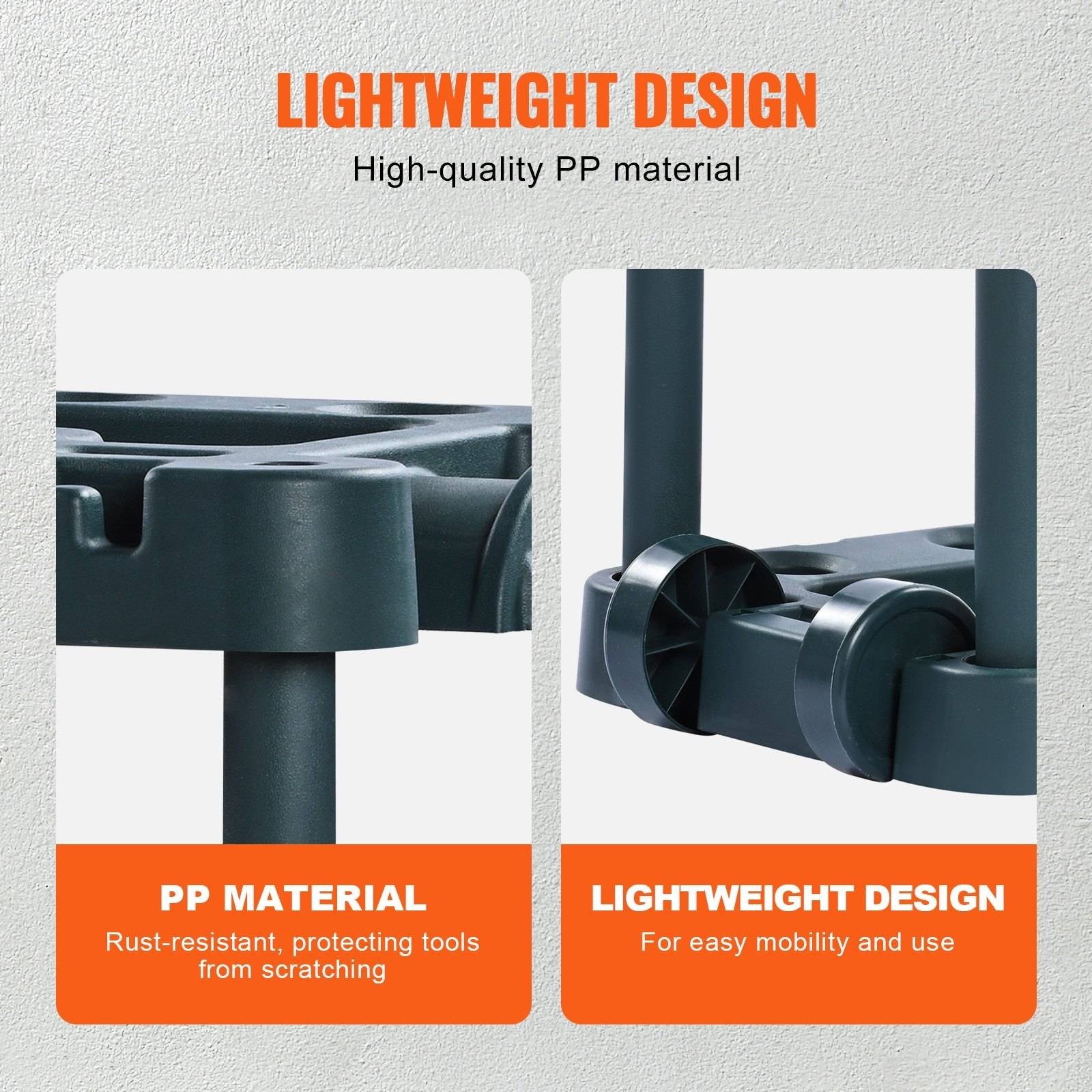 Αυτός ο οργανωτής για εργαλεία κήπου, κατασκευασμένος από υψηλής ποιότητας PP (πολυπροπυλένιο), είναι ανθεκτικός στις καιρικές συνθήκες και στη φθορά. Με όλα τα εξαρτήματά του, ζυγίζει μόνο 3,25 kg. Οι ανθεκτικές κάθετες σωλήνες αυξάνουν τη σταθερότητα και τη φέρουσα ικανότητα, έτσι ώστε να μετακινείται εύκολα και ταυτόχρονα να παραμένει απολύτως σταθερός.